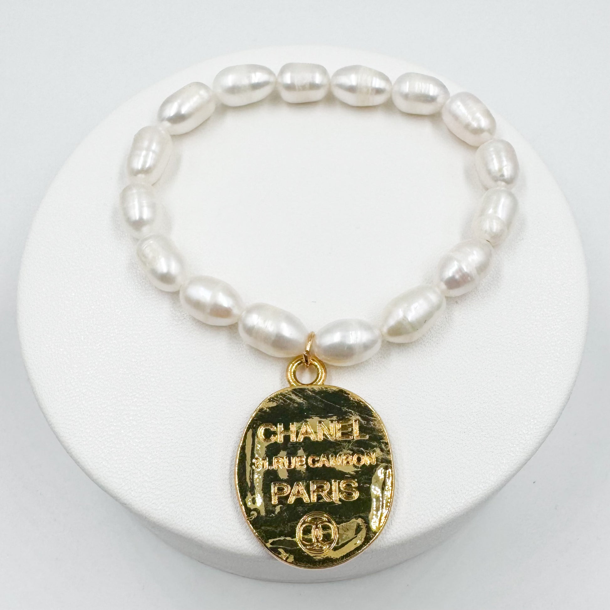 Plaque recto verso de 2,2 x 3 cm montés sur un bracelet de perles d’eau douce.