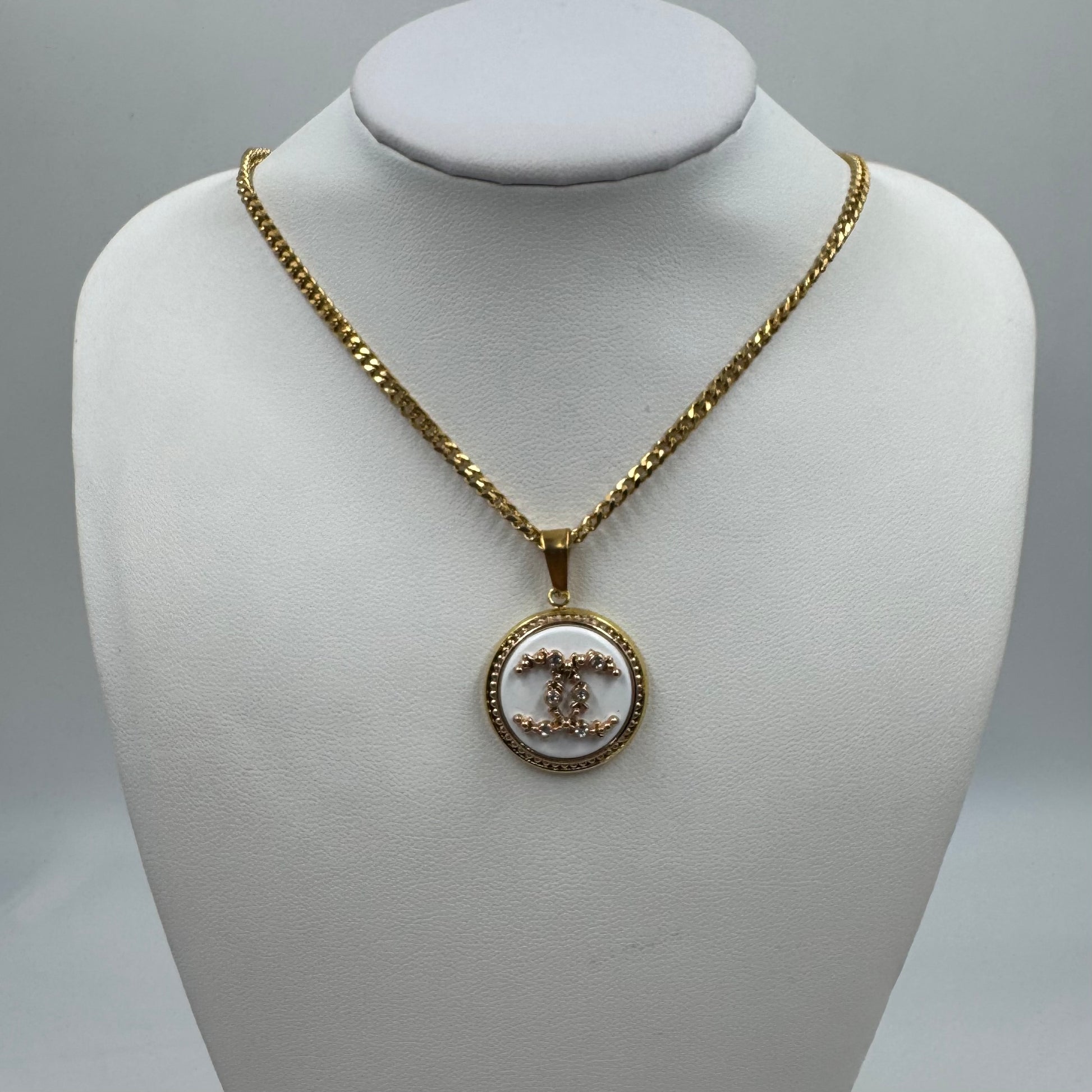 Bouton de 2,2 cm monté en collier sur une chaîne en acier inoxydable de 45 cm.